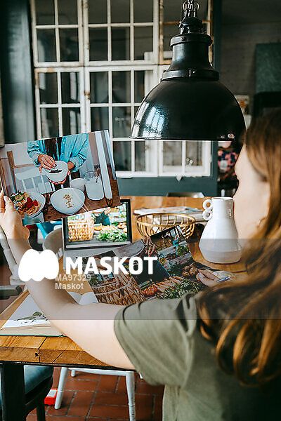 Kvinna sitter vid bord och håller upp fotografi i solljus