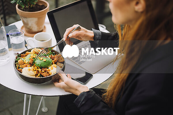 Kvinnlig frilansare äter lunch och arbetar på laptop