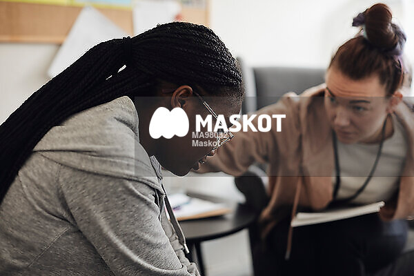 Skolsköterska tröstar ledsen kvinnlig elev i skola