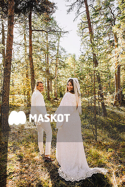Porträtt av nygift par gående genom skog