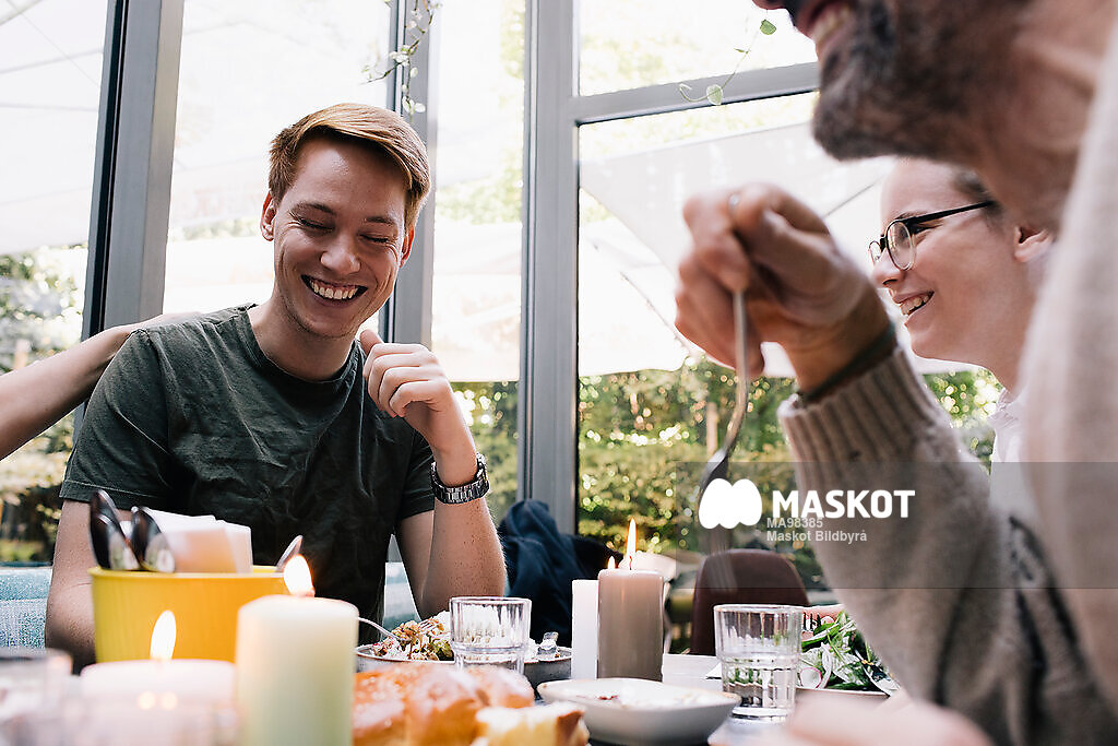 Glad man äter mat med familj på restaurang