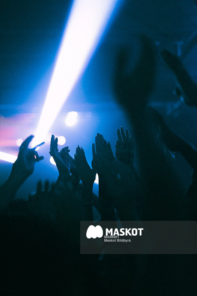 Människors höjda händer i strålkastarljus på nattklubb