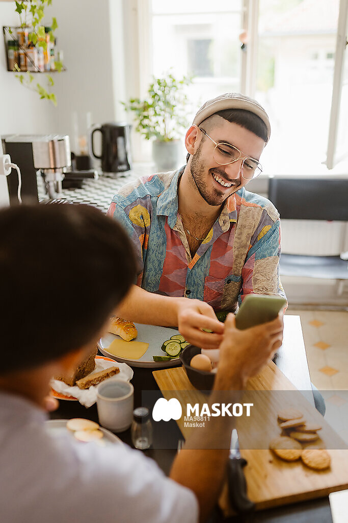 Man visar glad pojkvän smartphone vid matbord hemma