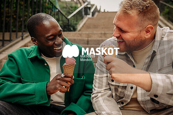 Glada manliga vänner äter glass sittande på trappa utomhus