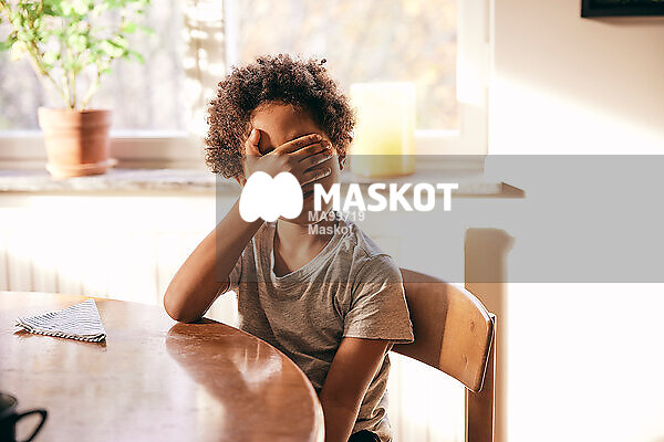 Pojke täcker ögon sittande vid matbord hemma