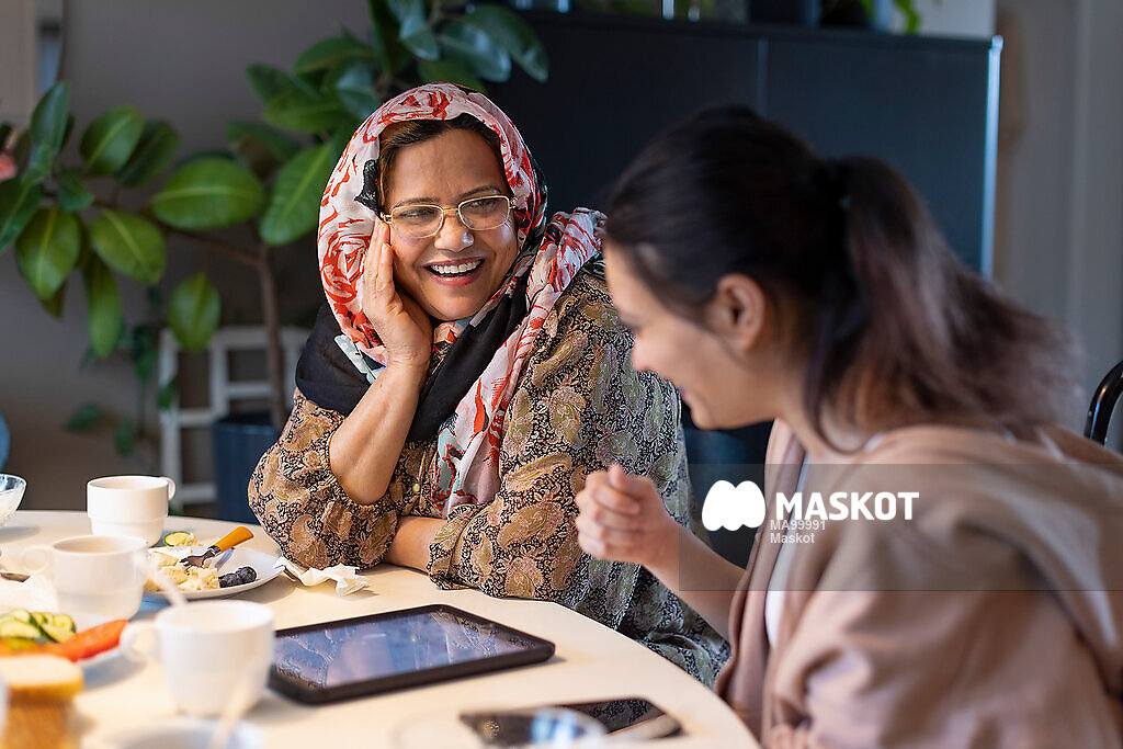 Glad mamma pratar med dotter som använder surfplatta vid bord