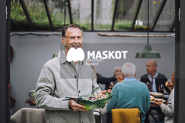 Porträtt av leende äldre man hållande i salladskål framför sittande vänner