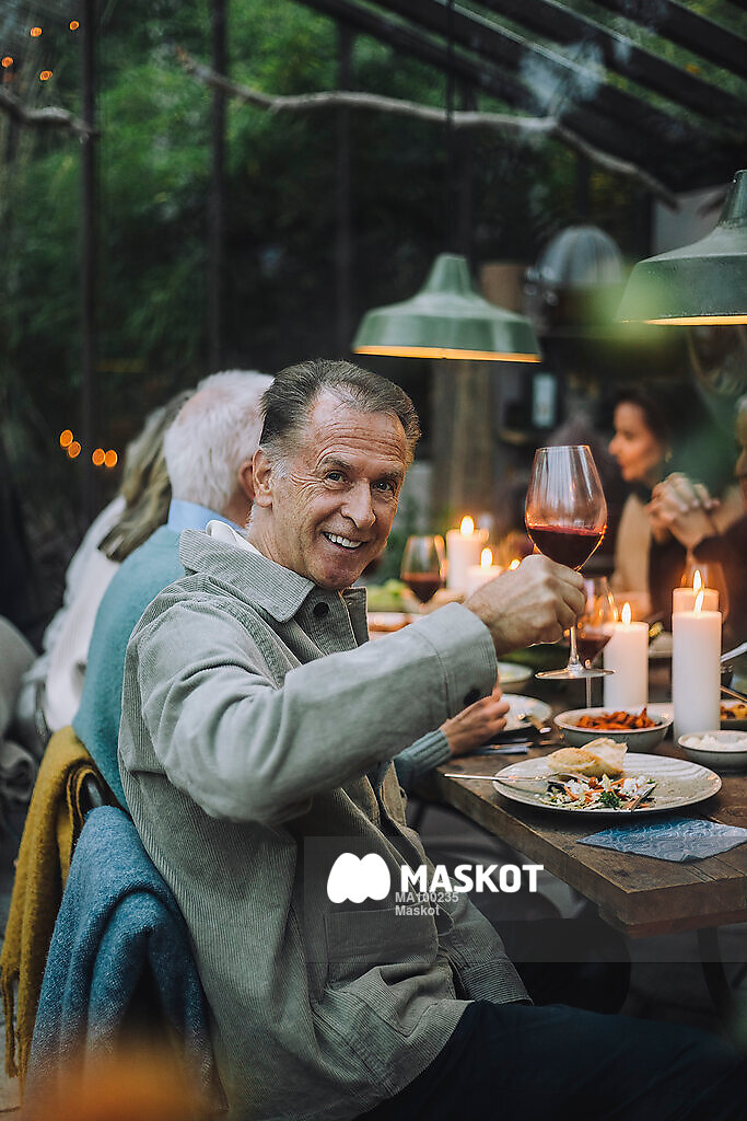 Porträtt av glad äldre man som håller i vinglas sittande vid bord