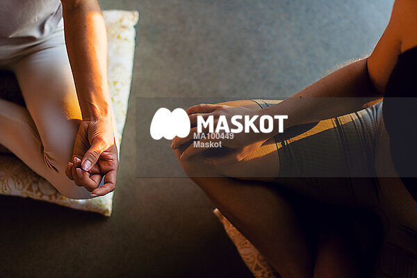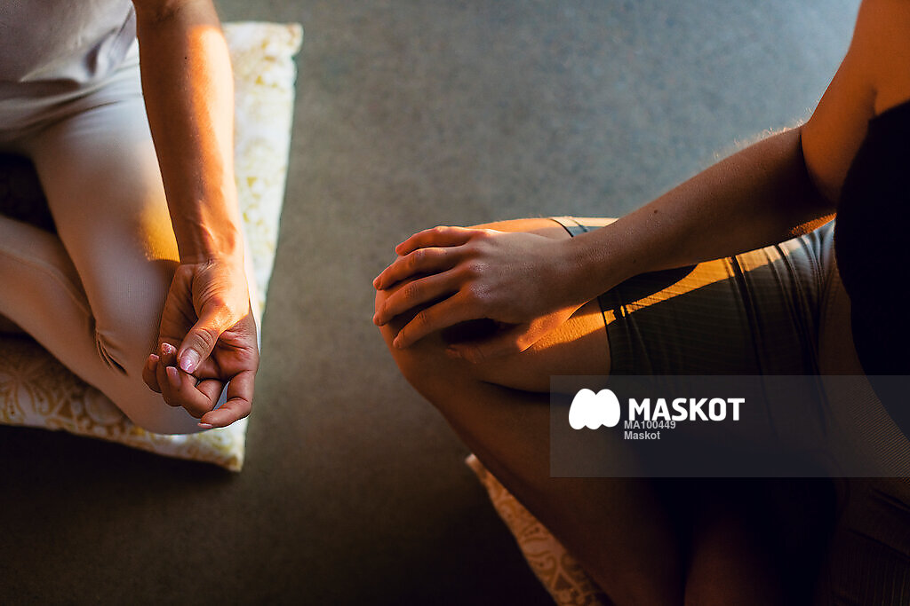 Kvinna sitter i yogastudio och mediterar
