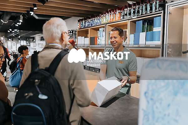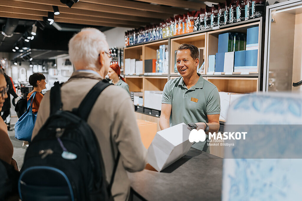 Leende manlig försäljare hjälper kund i kassa