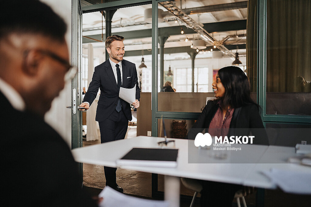 Leende affärsman pratar med kvinnlig kollega som sitter i konferensrum