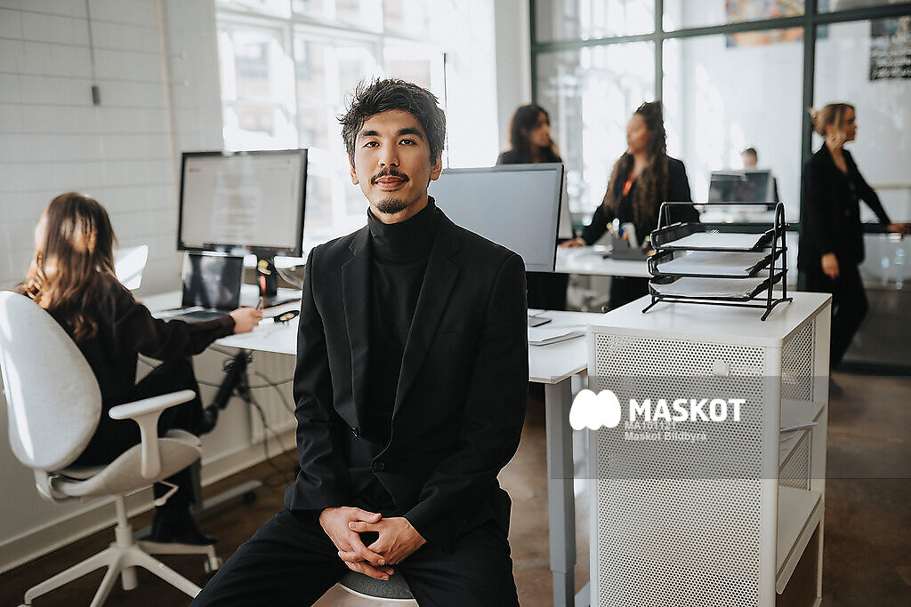 Porträtt av självsäker affärsman som sitter på kontor