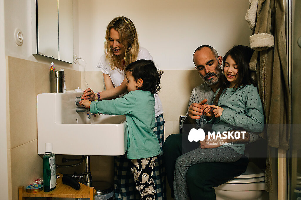 Familj umgås på badrum och mamma hjälper son tvätta händerna
