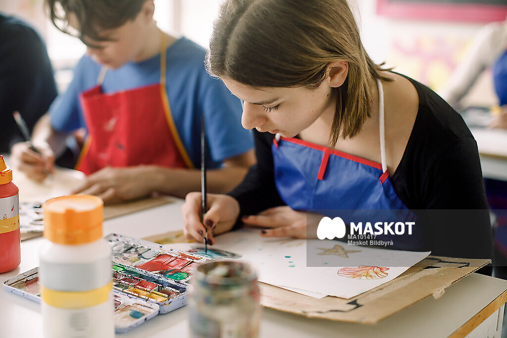 Tonårstjej målar under lektion bredvid klasskompis