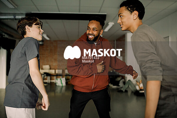 Glad manlig danslärare visar tonårskillar under lektion