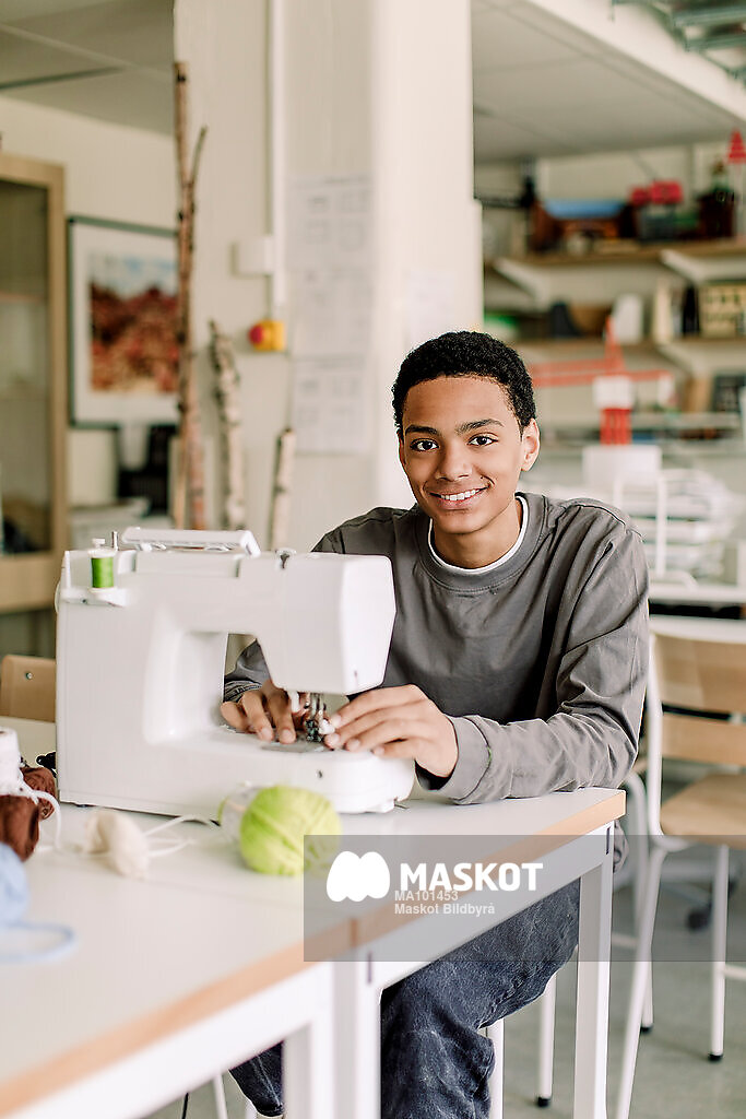 Porträtt av glad tonårskille med symaskin under lektion