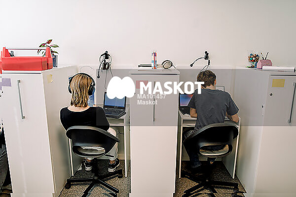 Kvinnlig och manlig student studerar på laptop vid skrivbord