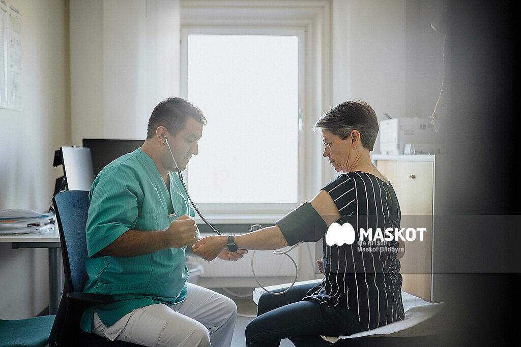 Manlig läkare undersöker äldre kvinna under läkarbesök