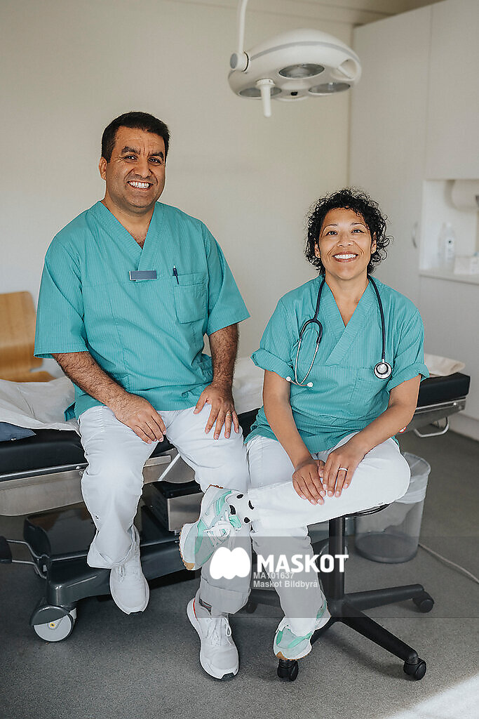 Porträtt av glad manlig och kvinnlig läkare på sjukhus
