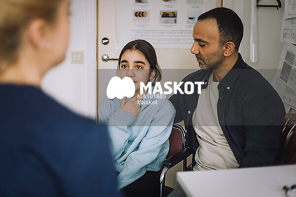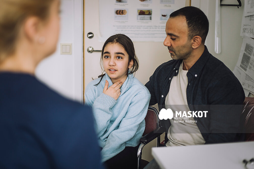 Flicka pratar med sjuksköterska sittande bredvid pappa