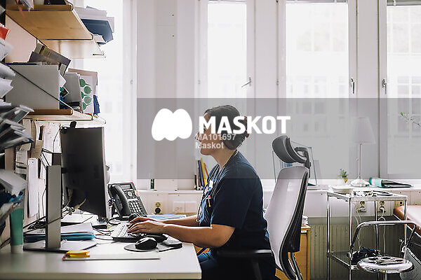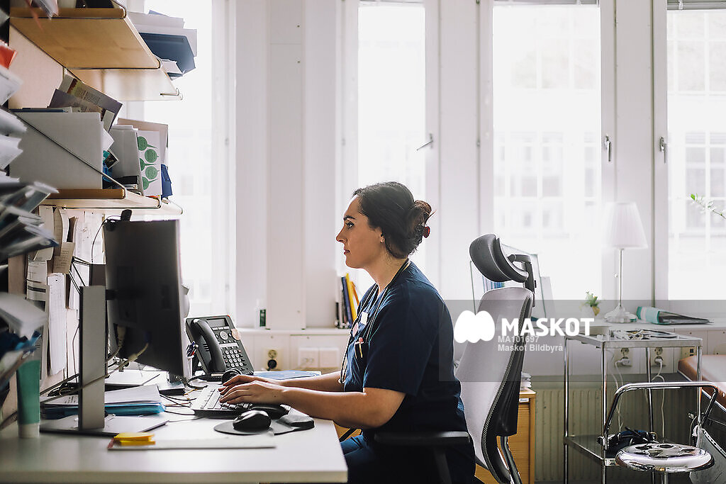 Kvinnlig sjuksköterska arbetar framför dator på sjukhus