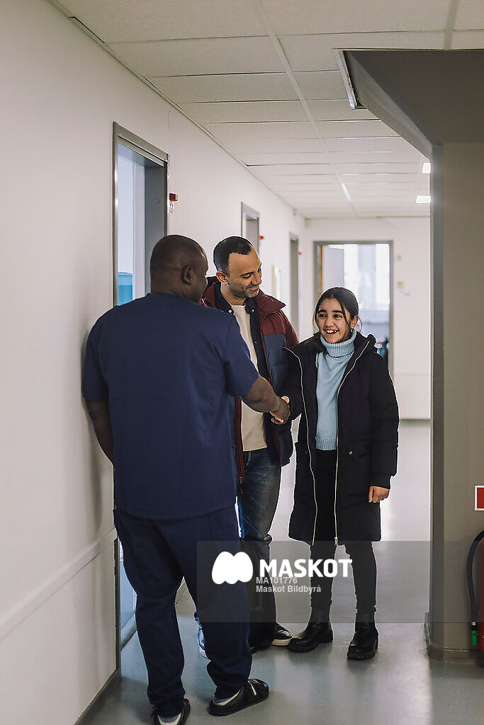 Leende flicka står med pappa och skakar hand med läkare