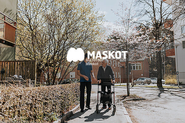 Äldre man med rullator går med vårdassistent utomhus