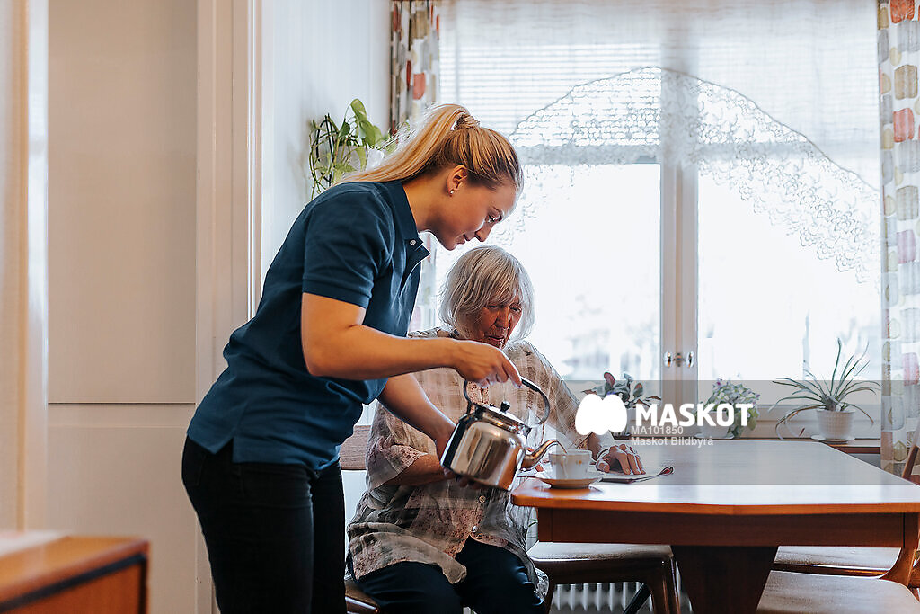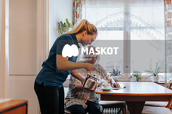 Kvinnlig vårdassistent häller upp te till äldre kvinna