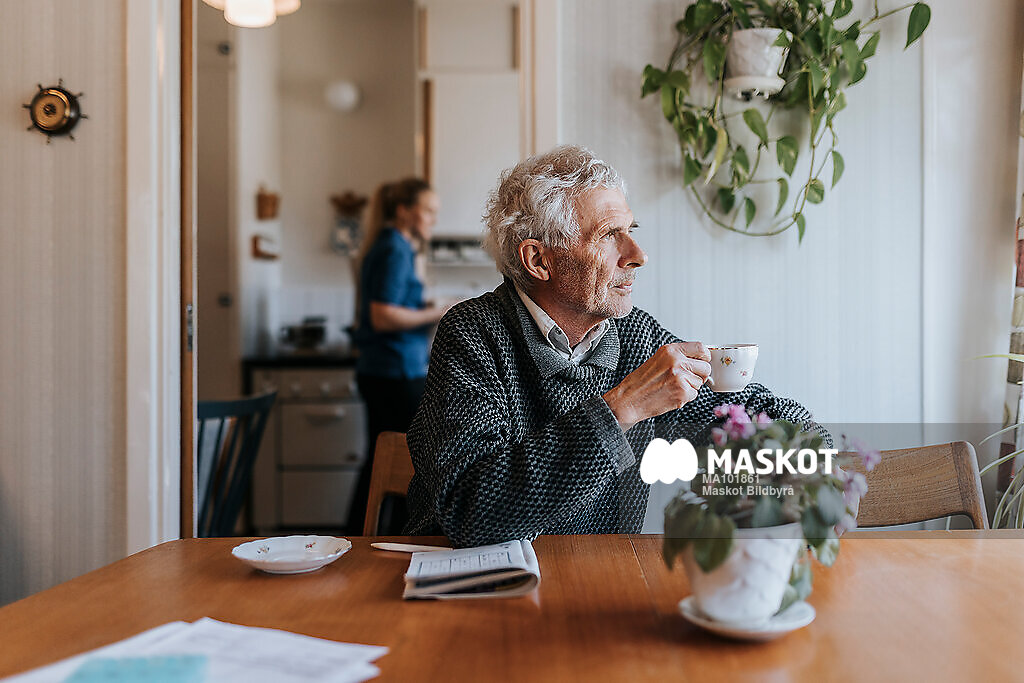 Fundersam äldre man dricker te och tittar bort