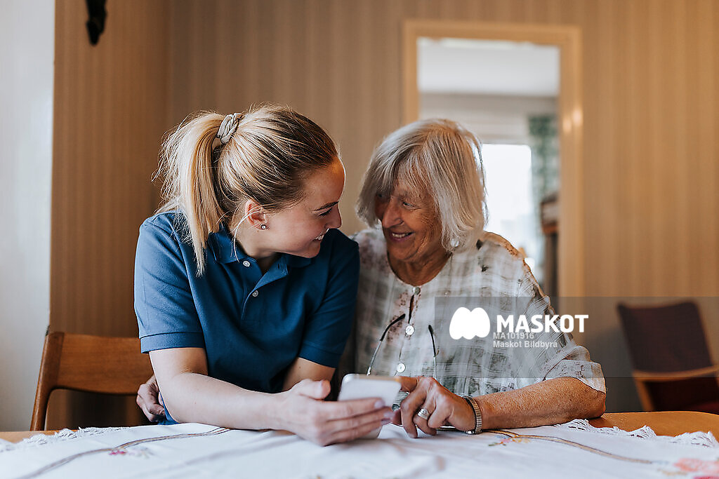 Leende kvinnlig vårdassistent pratar med glad äldre kvinna