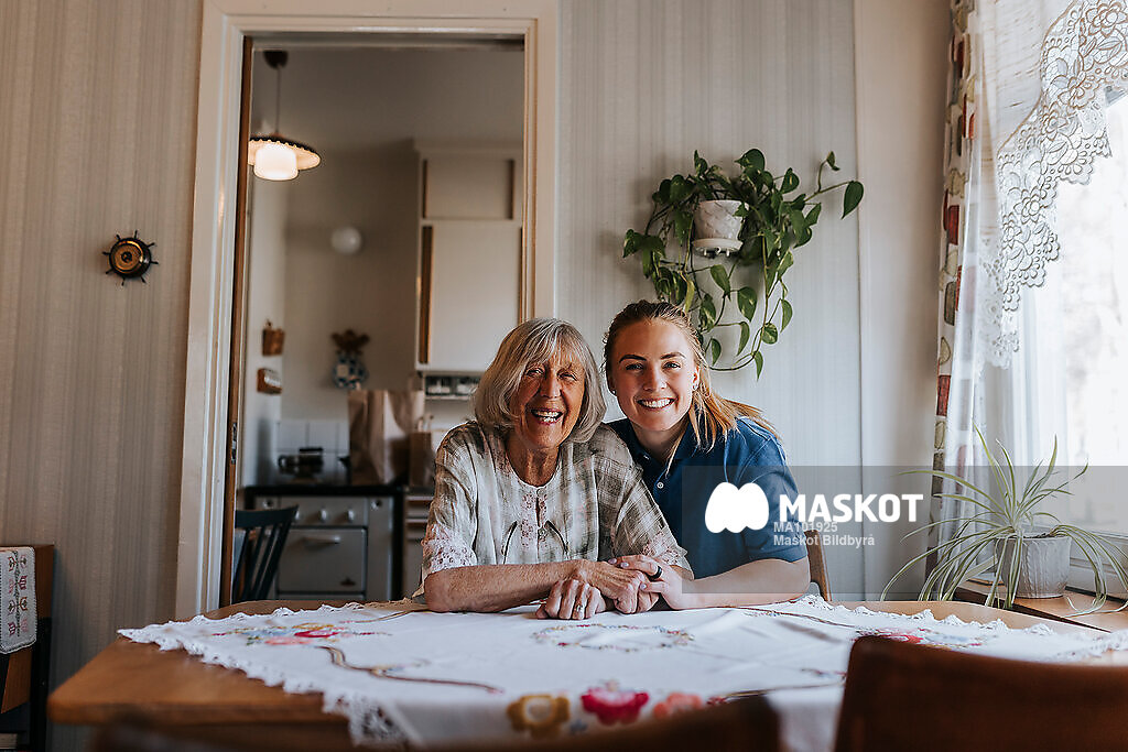 Porträtt av glad äldre kvinna och kvinnlig vårdassistent