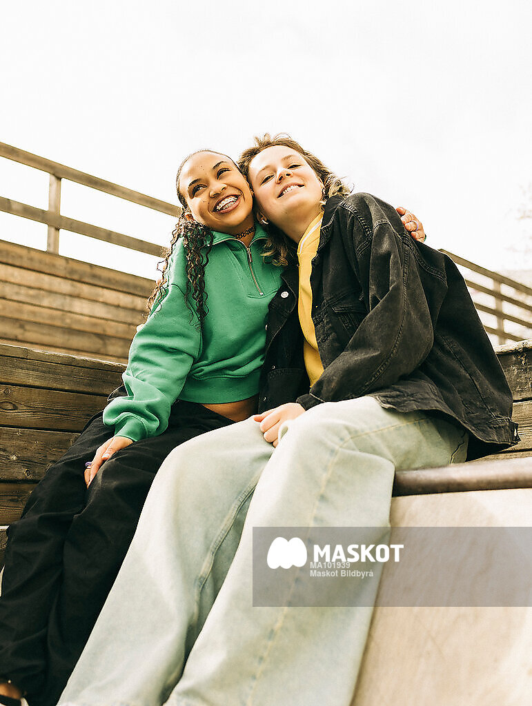 Porträtt av glad tjej som omfamnar tjejkompis