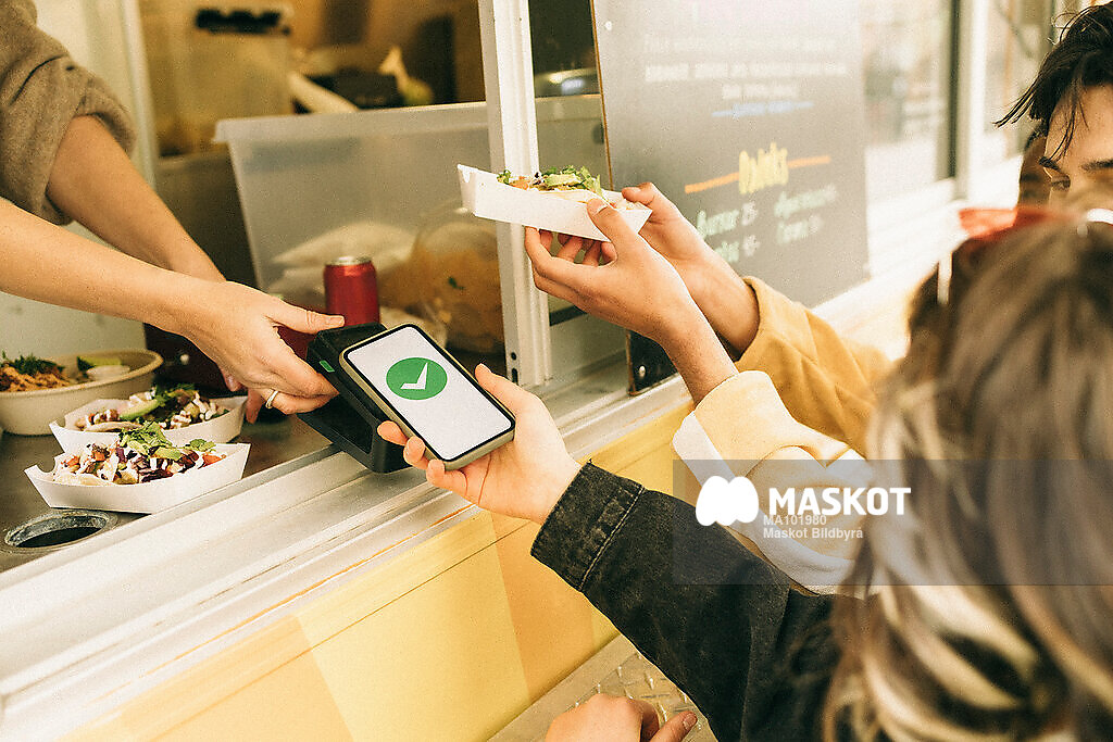 Bild av tjej som betalar med smartphone på gaturestaurang
