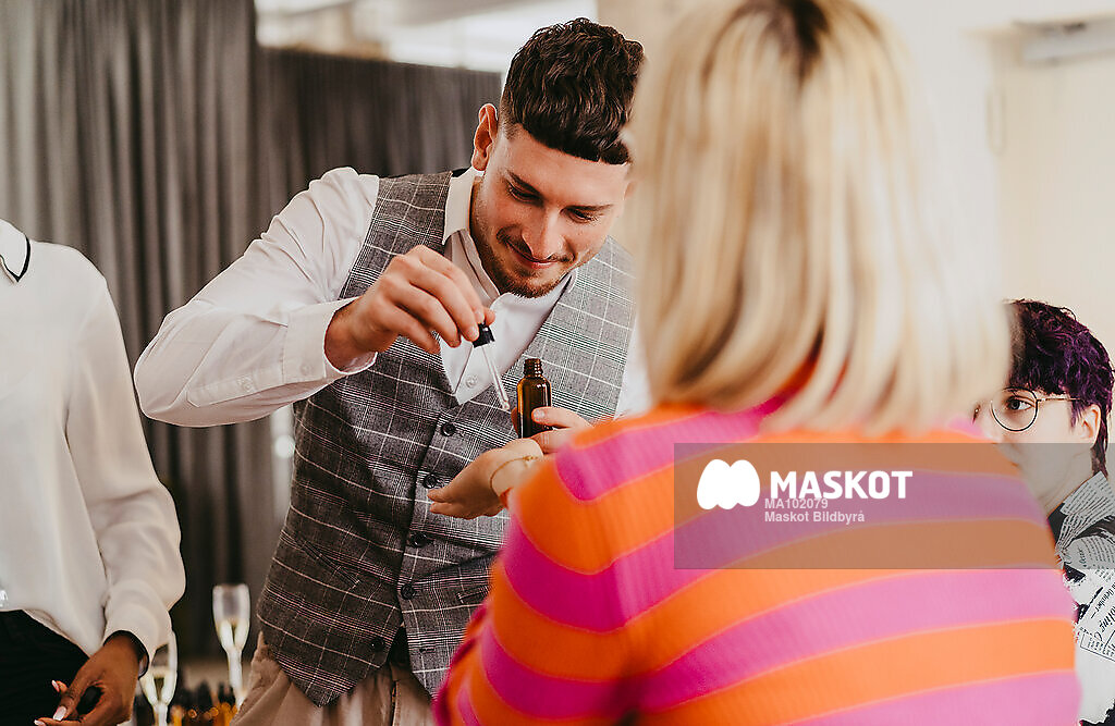 Leende affärsman testar produkt på kvinnlig kollega under företagsevent