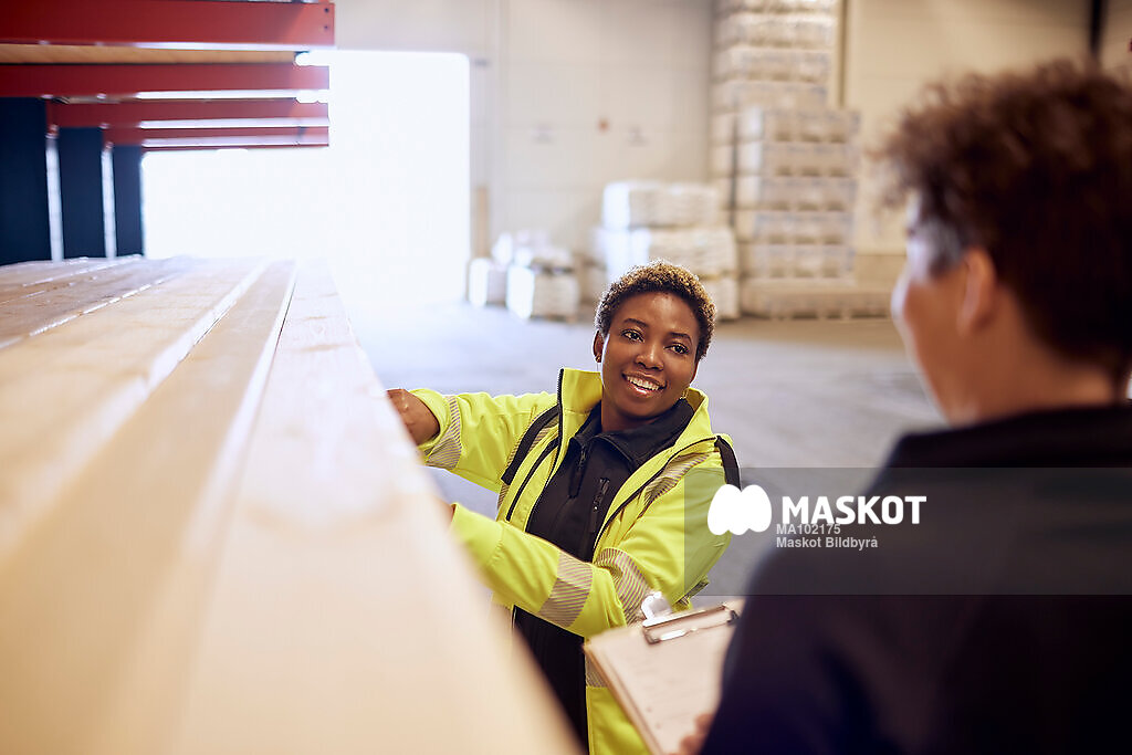 Leende kvinna i arbetskläder pratar med kollega vid plankor