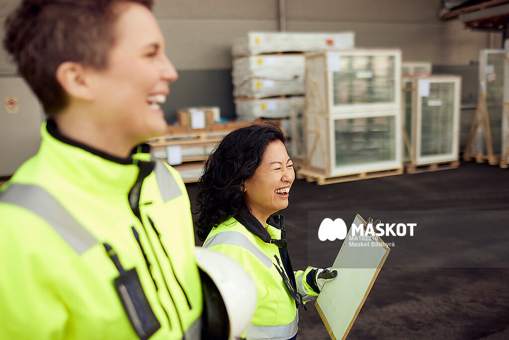 Glada kvinnliga kollegor pratar och skrattar på lager