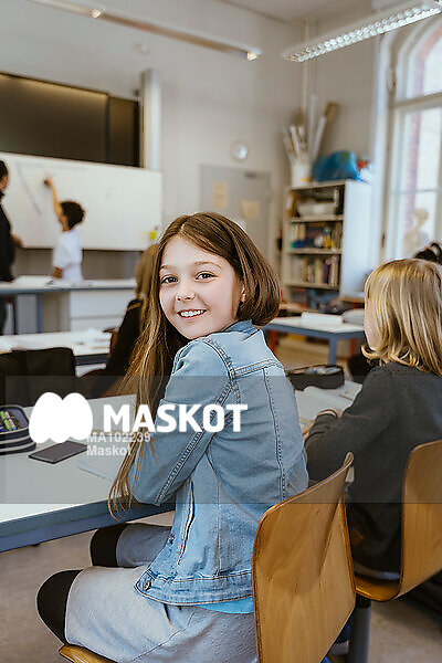 Porträtt av leende flicka som sitter bredvid kompis i klassrum