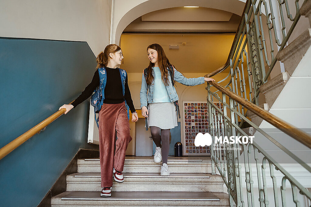 Leende tjejkompisar går nedför trappa i skola