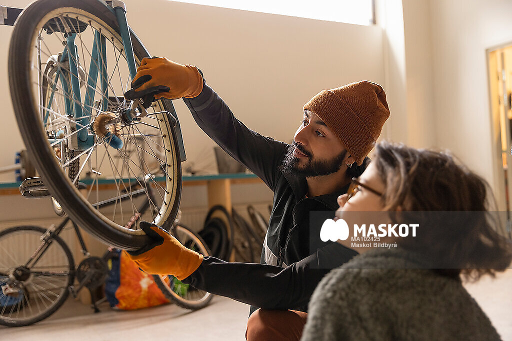 Manlig arbetare med mössa sätter på hjul på cykel