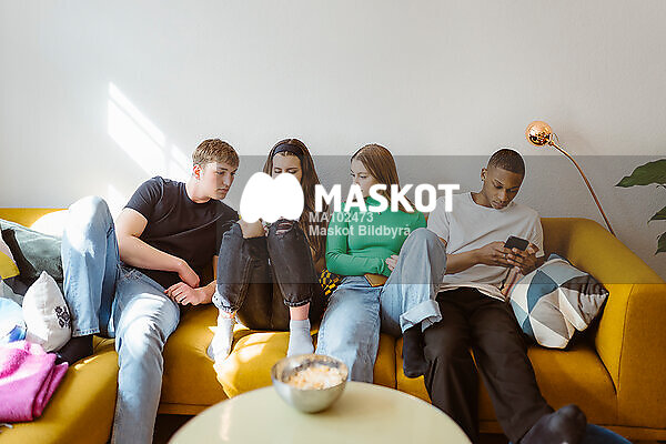 Unga vänner sitter i soffa och använder smartphone