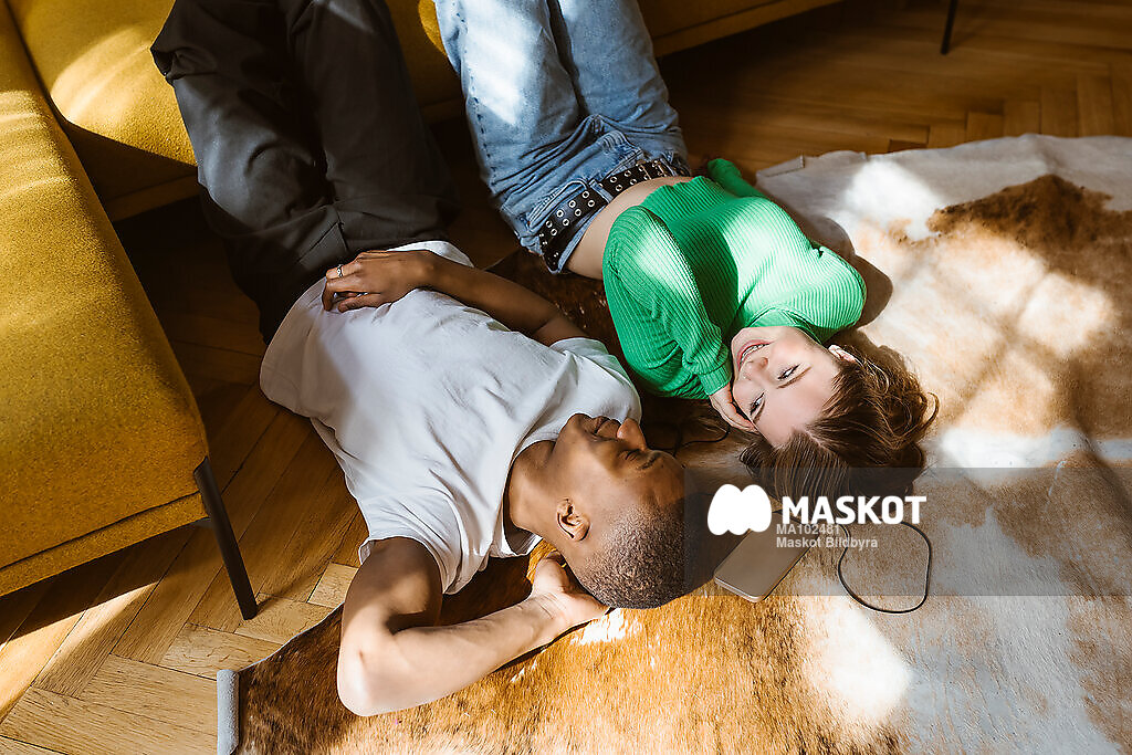 Kärleksfullt par ligger på golv och tittar på varandra