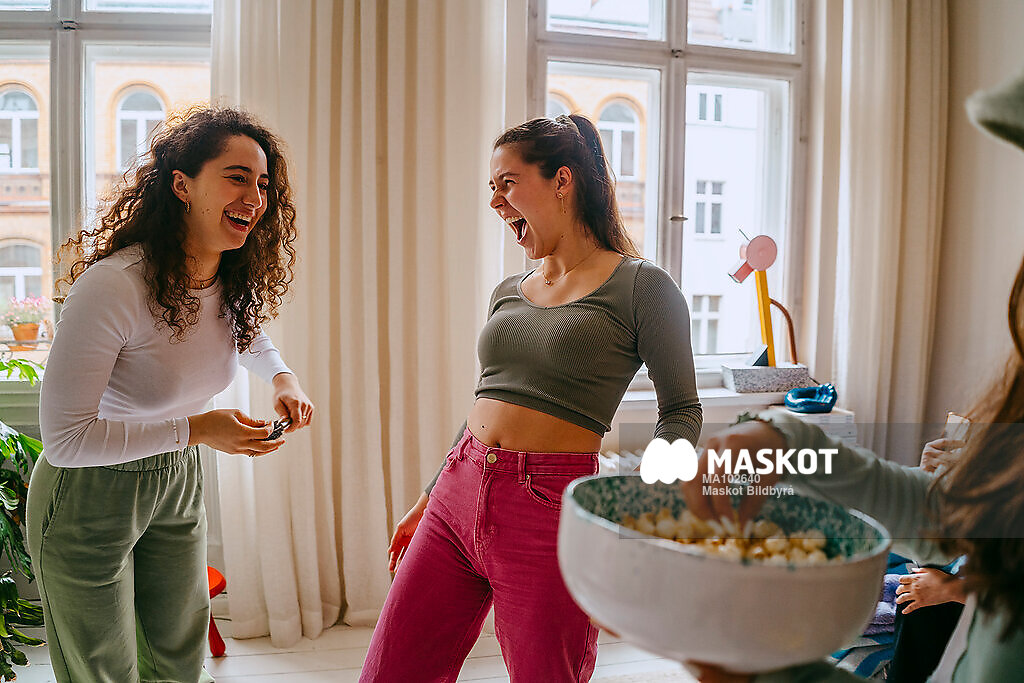 Glada tjejkompisar umgås tillsammans hemma