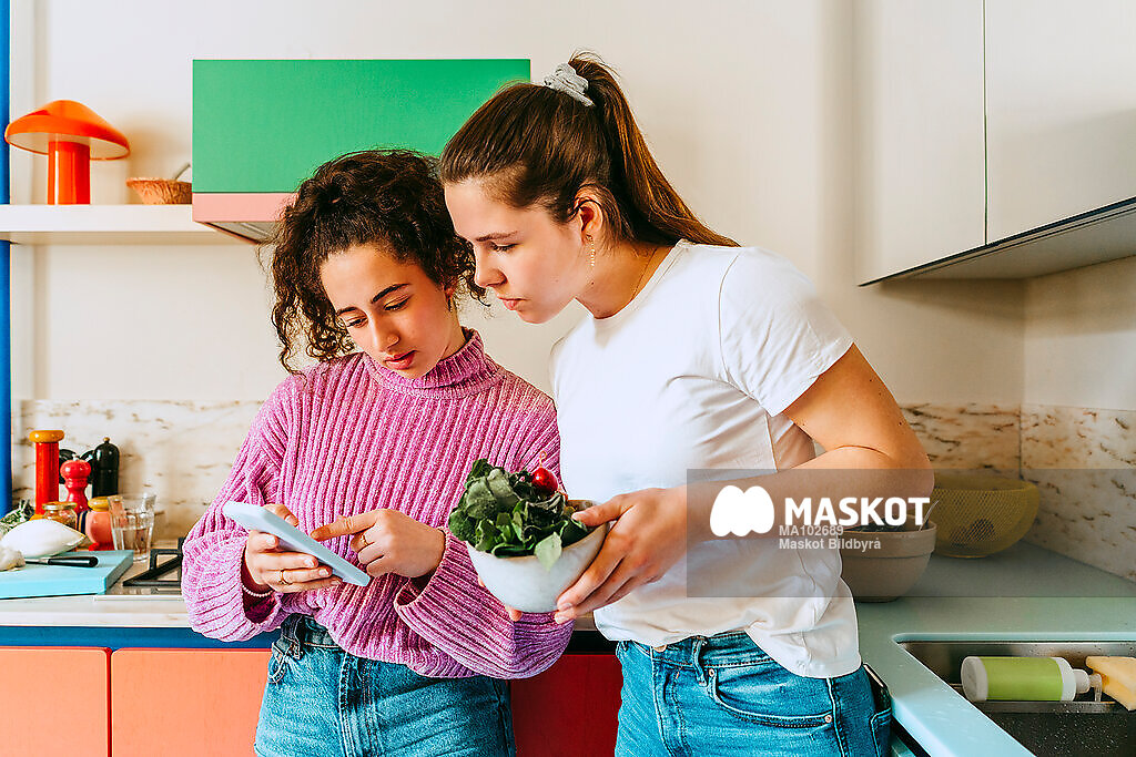 Unga kvinnor tittar på smartphone stående i kök