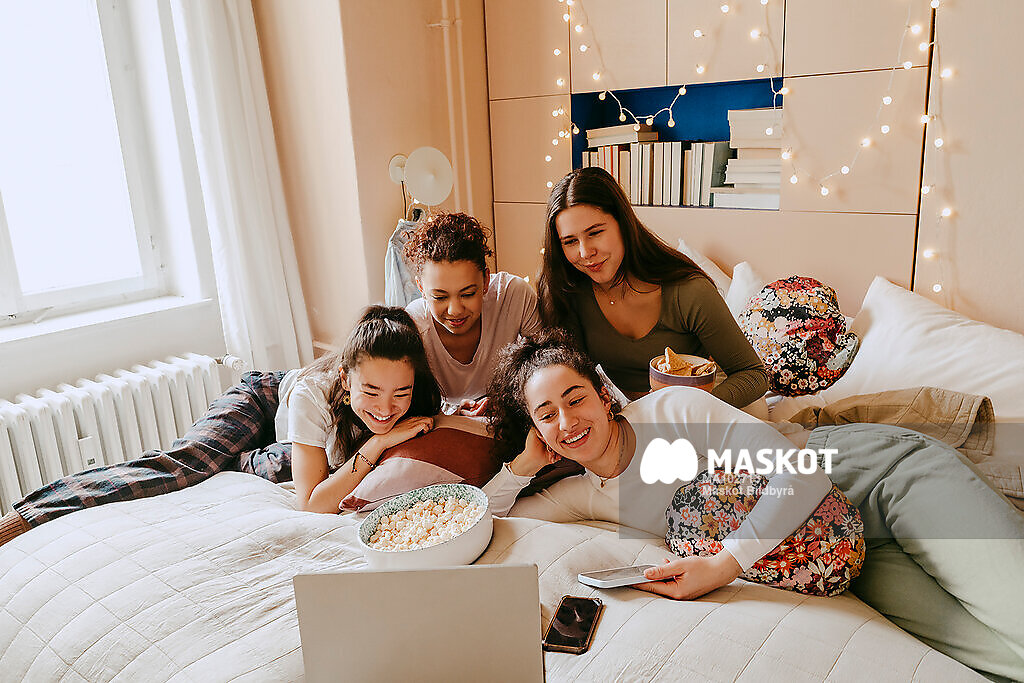 Glada tjejkompisar kollar film på laptop sittande i säng