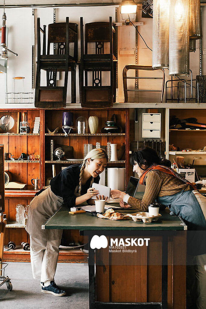 Kvinnliga arbetarkollegor diskuterar i butik