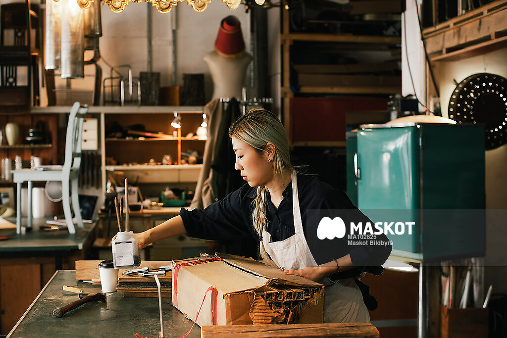 Kvinnlig hantverkare med förkläde arbetar i butik