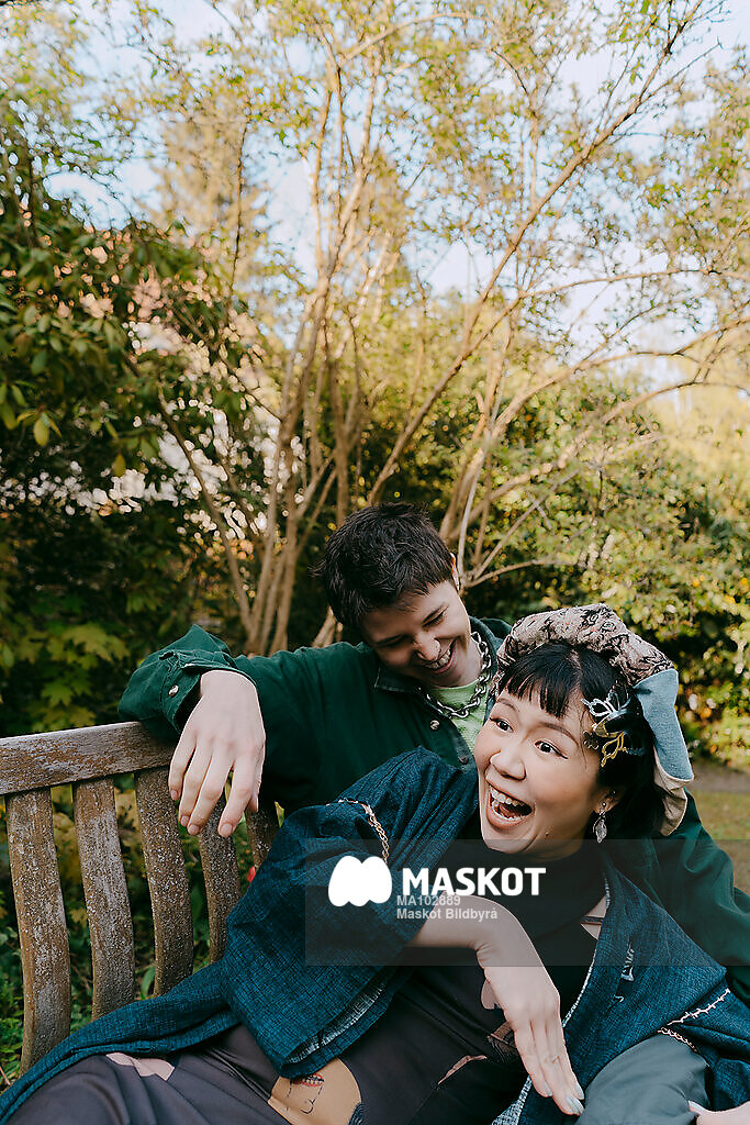 Lekfull kvinna sitter med kompis på bänk utomhus