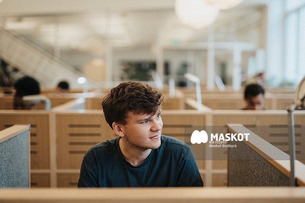 Leende manlig student tittar bort sittande i biblotek
