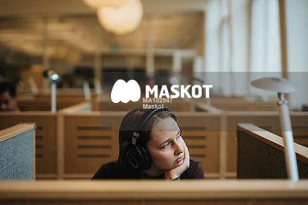 Eftertänksam ung kvinna med hörlurar kollar bort