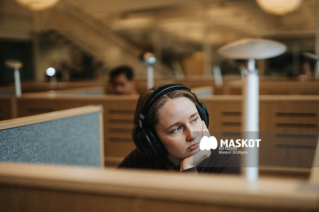 Fundersam ung kvinna med hörlurar kollar bort sittande i biblotek